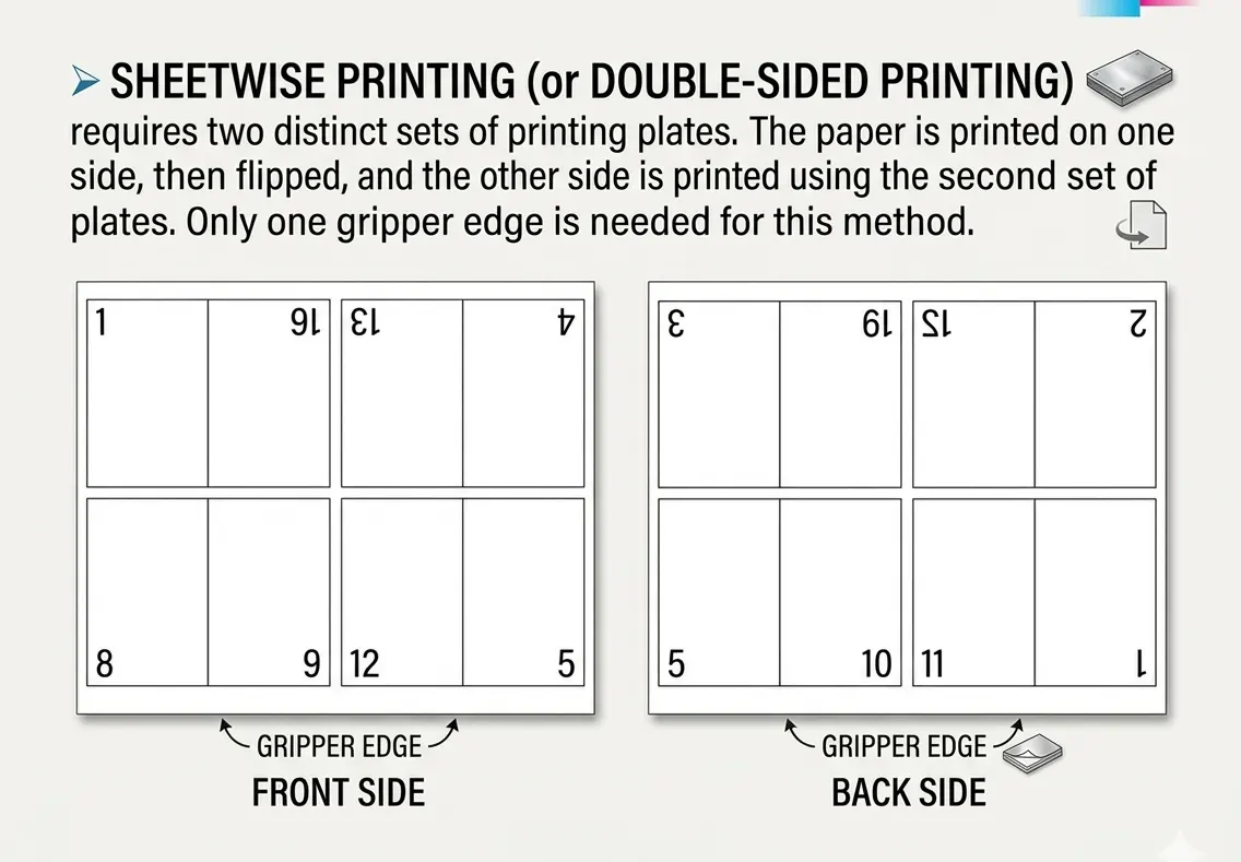 - Process: The sheet is printed on one side, flipped horizontally (keeping the same Gripper Edge), and printed again on the back.